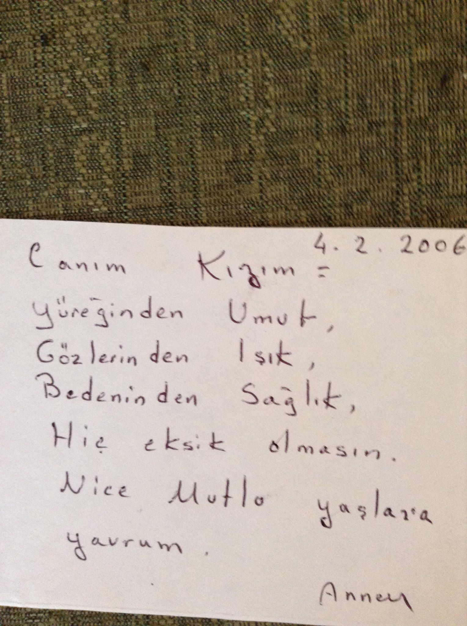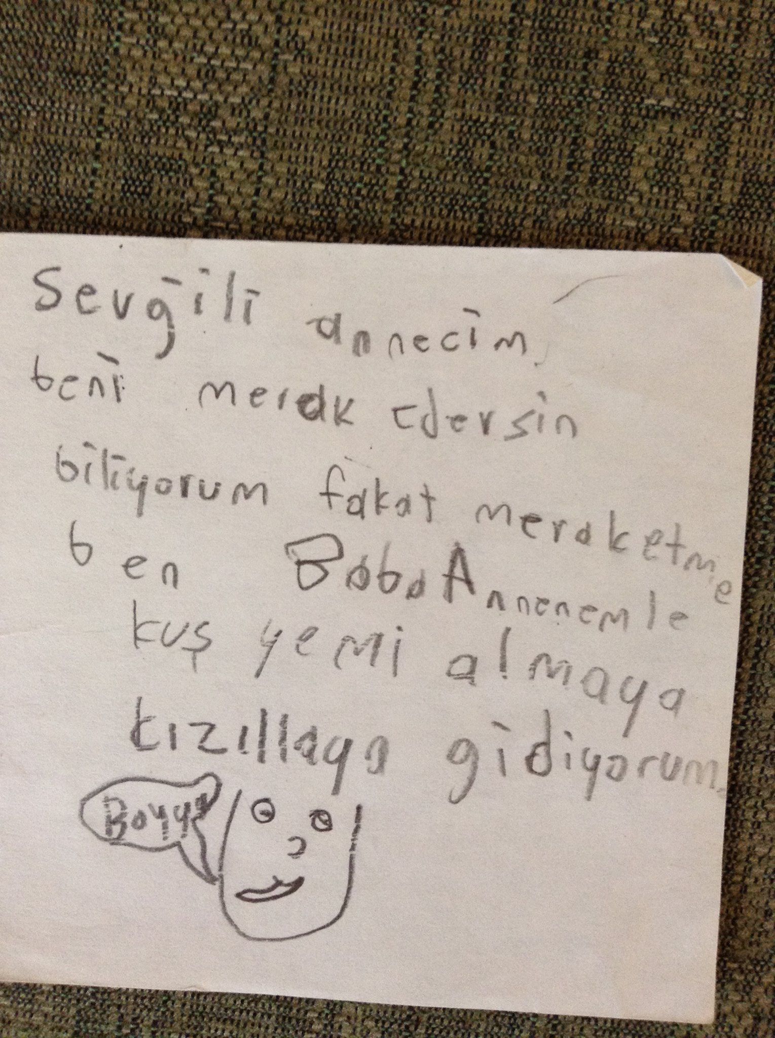 Bir de şu sevimli notu buldum. Herhalde ilkokuldayken Ankara’ya gittiğimiz günlerden birinde yazmış oğlum :