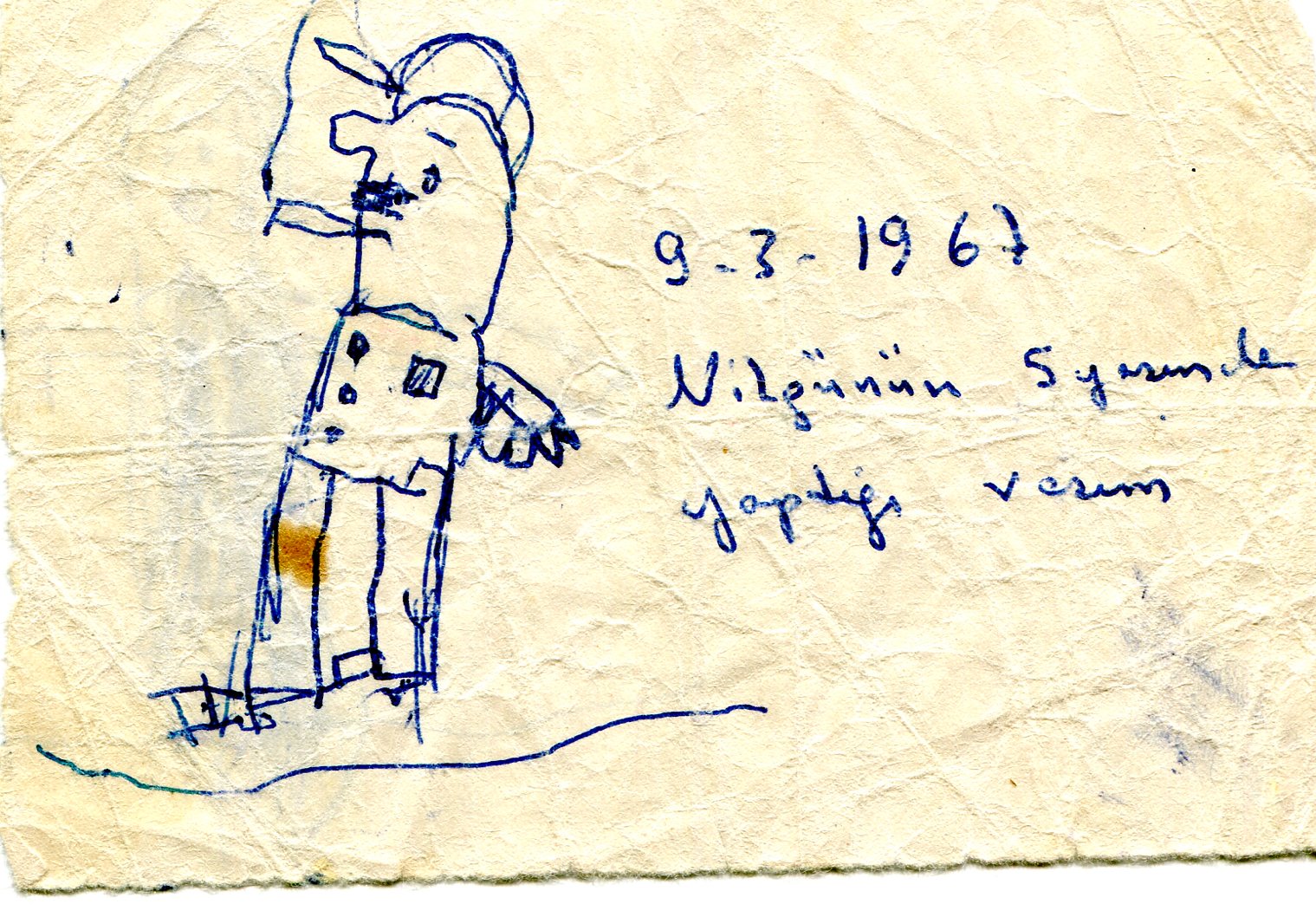 Anneciğim benim aksime hiç saklama huyu olmayan bir kadındır. Günün okunmuş gazetesini bile, saat 12 olmadan kapının önüne koyar. Yine de kutudan benim için sakladığı bir resim çıktı. Ben beş yaşındayken çizmişim. Bekçi midir nedir, bilemiyorum ama , beş yaş için epeyce ayrıntılı bir çizim gibi gözüküyor.