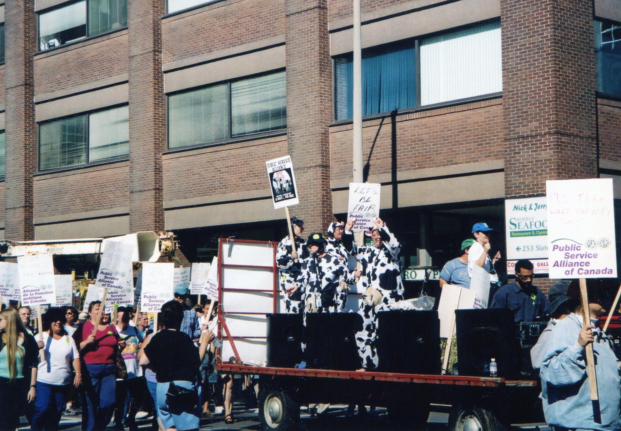 Bir kahveye uğrayıp kahve içip donut yedik . Çıktığımızda cadde müthiş kalabalıktı. Polisler yolu kesmişlerdi. Ne olduğuna baktık. Yürüyüş…. Yüzde iki zam alan memurlar gösteri yürüyüşü düzenlemişler. Müzik vardı, pankartlar vardı. İnsanlar inek kılığına girmiş, “Sağılmak istemiyoruz” diyorlardı. Hemen fotoğraflarını çektim. Ne cop vardı , ne de dayak. Polisler güler yüzlü, insanlar sabırla bekliyordu. Hatta arabalarının kornalarına basıp, destek veriyorlardı. Şaşkın şaşkın seyrettik.