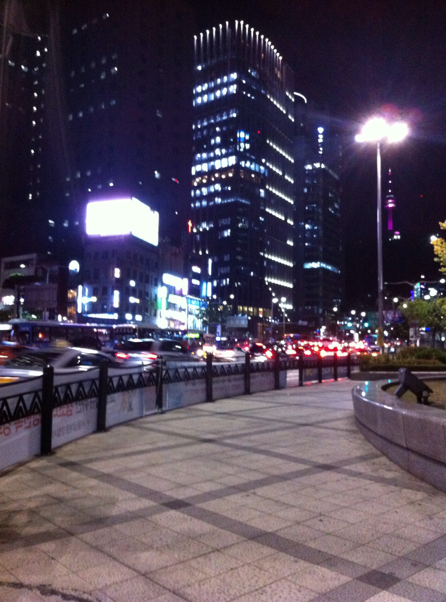 Daha sonra mağazaların olduğu kısma doğru yürüdük. Hava yavaş yavaş karardı, böylece Seoul’ü ilk defa gece görmüş olduk.